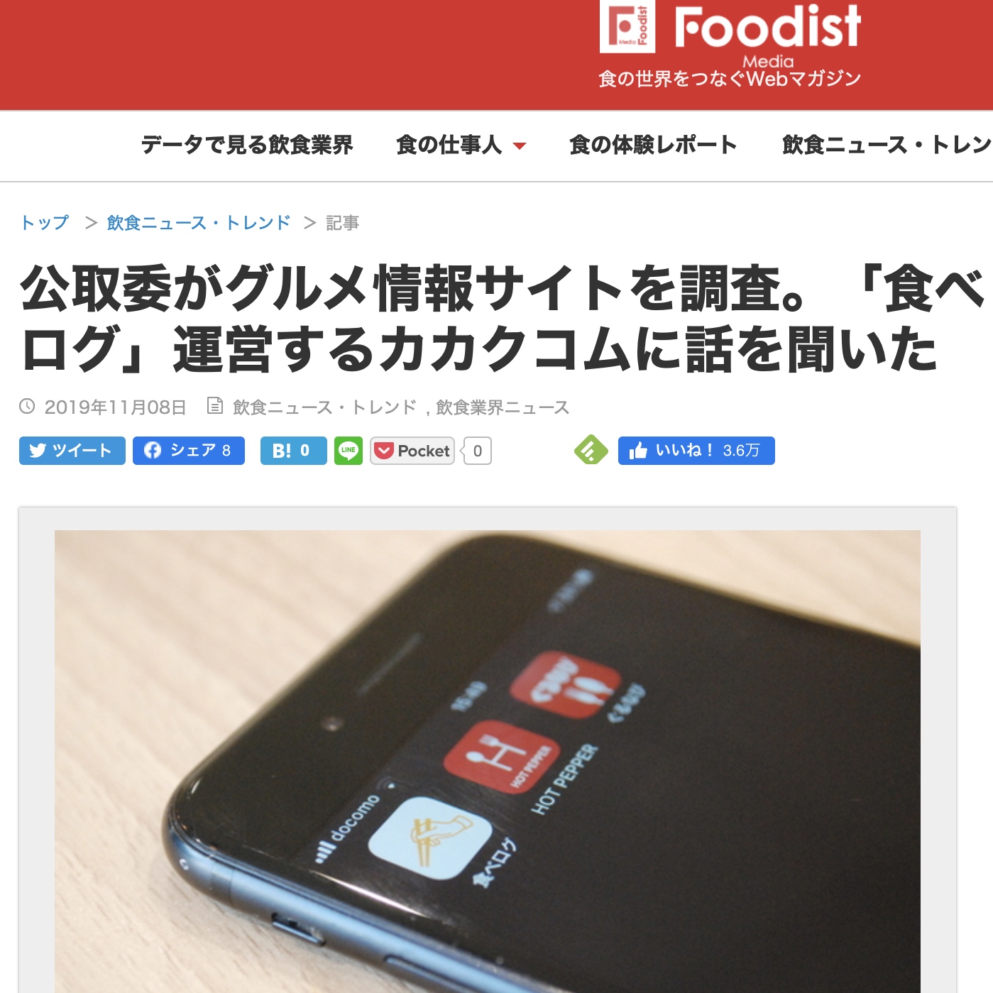 記事はFoodist Media編集部と打ち合わせをして10の質問項目を作り、文書で回答をいただくというもの。タイトルは「公取委がグルメ情報サイトを調査。『食べログ』運営するカカクコムに話を聞いた」。