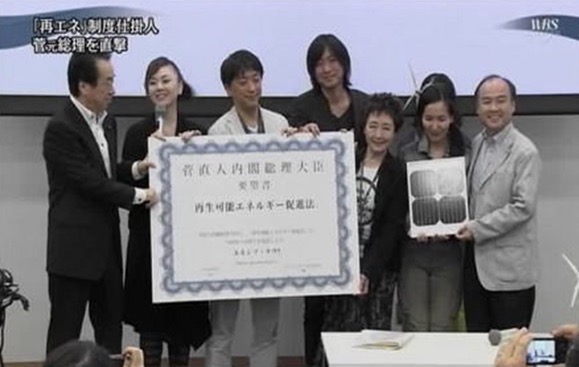 孫正義氏ら再エネ振興策を喜ぶ文化人と菅直人首相(当時、テレビ東京WBS画面から)
