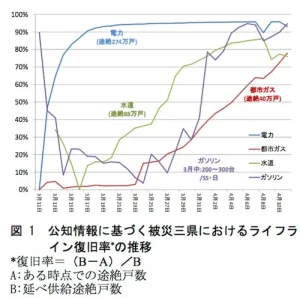 また電力はライフラインの中で、復旧が早い。2011年の東日本大震災での被災3県のライフライン復旧率の推移」(表1)を見ると、地震で274万戸が停電したが、6日後には電力の復旧率は9割を超えた。水道やガソリン、都市ガスは1か月半が経過しても復旧は8割台だった。電線が地上に露出しているために他のインフラより整備がしやすいという点もあるのだろうが、東北電力、東京電力の復旧能力の高さによるものだ。