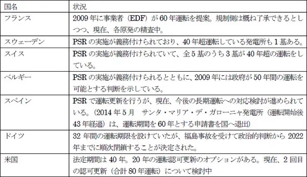 以下は2012年に衆議院に提出された各国の運転期間の一覧だが、どの国も時間にこだわっていない(法制定時の国会資料から。制度は同年時点、PSRとは定期安全レビュー(Periodic Safety Review)のことで10年ごとに施設の運転者による定期的な施設安全性の点検義務のこと)。
