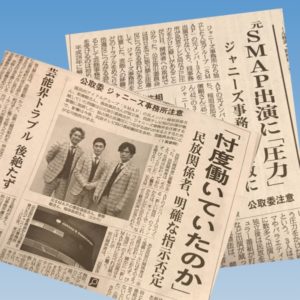 2019年7月17日20時59分頃、NHKが「元SMAP3人のテレビ出演に圧力をかけた疑いで、公正取引委員会がジャニーズ事務所を注意」という趣旨のブレーキングニュースをテロップで流した。さらにその後の「ニュースウォッチ9」で詳細に報道された。このニュースについて日刊スポーツが関連ニュースをネットで公開したのが23時52分と実に3時間近くかかっている。この空白の時間に、スポーツ新聞の宿痾のようなものを感じる。