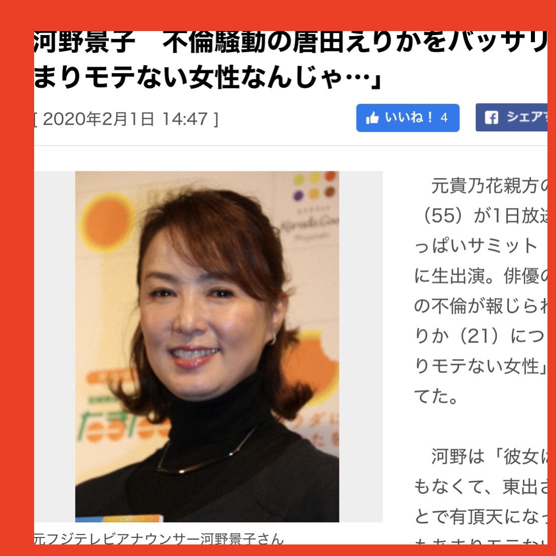 スポニチ電子版2月1日付けの「河野景子 不倫騒動の唐田えりかをバッサリ『そもそもあまりモテない女性なんじゃ…』」によると、河野景子さんは番組内で「彼女はまだ若い。恋愛経験もなくて、東出さんと恋愛していることで有頂天になってしまって。そもそもあまりモテない女性なんじゃないかと思う」と発言。さらに「本当なモテる人だったらその恋愛を隠す。それを出したいというのは恋愛経験がなくて、ちょっとね…って」と続けたという。