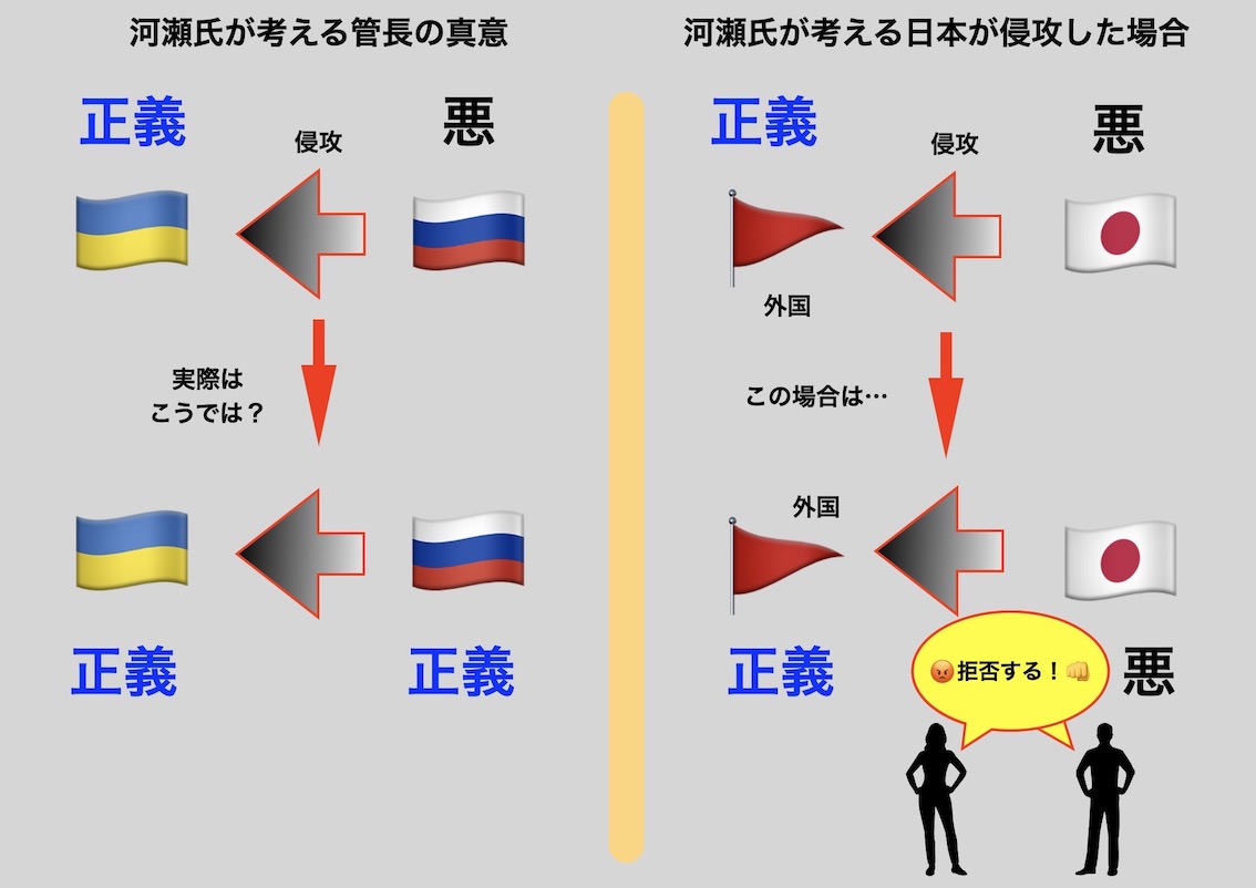 この主張を図式化したのが(図・河瀬氏の破綻した論理)である。ロシアの侵攻にも正義があるかもしれないと管長の言葉を推測しているのであるから、ロシアに正義があれば、ロシア人は侵攻に反対する必要はなくなる。