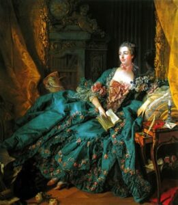 次にその約100年前の18世紀前半の女性の服装をみてみよう。写真はフランス王ルイ15世の愛人として有名なポンパドゥール夫人(1721-64年)の肖像だ。胸元を強調し、首筋を開いた服だ。富裕層の服装ということを考えても、オースティンとはかなり違う。これは一時的に気温が暖かくなっていたと推定される。もちろんオースティンの住んだイングランド南部よりも、フランスは低緯度で、やや気温は高い。また季節によって服の種類は違う。しかし地球全体の気温が18世紀前半は19世紀前半よりも高かったために、服のデザインが影響を受けたのかもしれない。