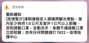 台湾では4月2日から5日までお墓参り休みの「清明節」4連休でした。驚いたことに、この時世に台湾中部・南部の観光地、景勝地には大勢の行楽客が押し寄せたのです。これに対し中央感染症指揮センターは「災防警細胞廣播訊息(Public Warning Cell Broadcast Service)」を通じ、中部・南部の景勝地に位置する携帯電話へ緊急メッセージを一斉配信しました。