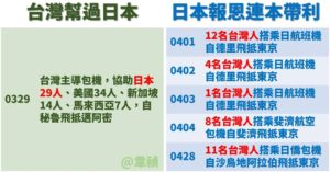 このユーザーは「ペルーの件で台湾は1機のチャーター機で29名の日本人を助けただけだが、日本は5機のチャーター機で36名の台湾人が搭乗した」と述べ、「台湾の手助け」とその後の「日本のそれ以上の恩返し」を表にして掲載、「台灣能夠幫忙日本的,日本的回報,完全遠遠多過台灣當初給的。 (台湾は日本を手助けしたが、日本の恩返しは台湾がしたことよりも遙かに多い)」と指摘しています。