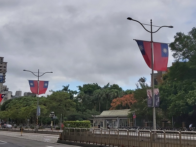 10月10日、街には中華民国の国旗「青天白日満地紅」が掲げられた (撮影・葛西健二)