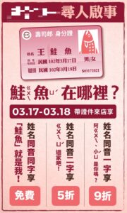 ある日系回転寿司チェーンの台湾法人は3月15日、同月17日と18日の2日間にわたり身分証明書の氏名に「鮭魚(サーモン)」の2文字が含まれている場合は本人と同伴者5人の食べ放題コースが無料になるキャンペーンを打ち出しました。