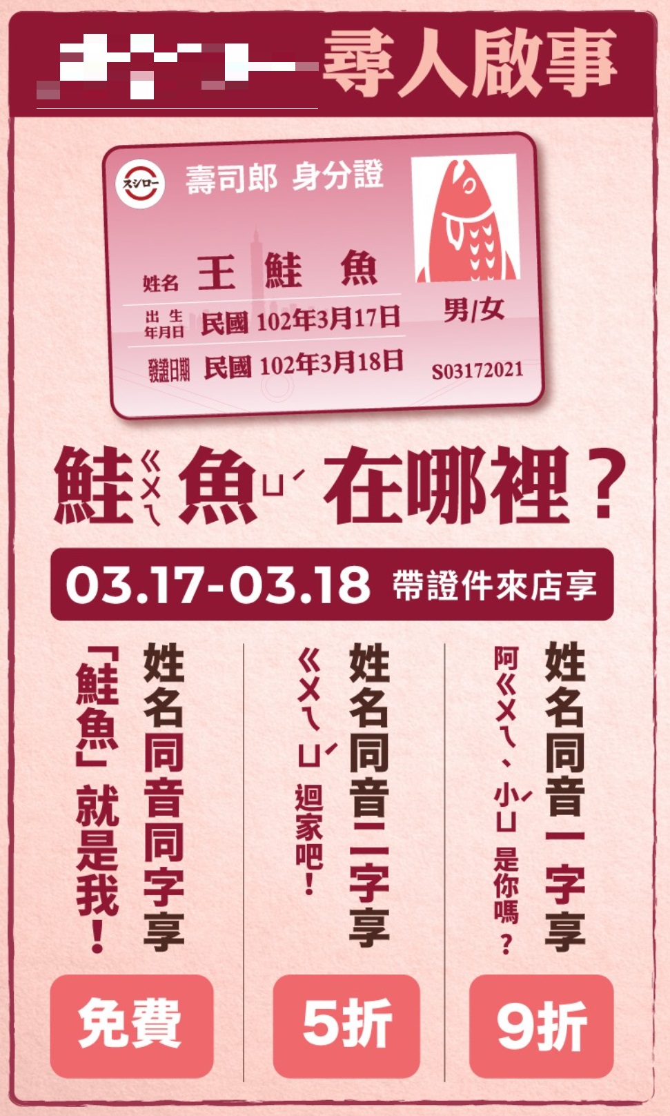ある日系回転寿司チェーンの台湾法人は3月15日、同月17日と18日の2日間にわたり身分証明書の氏名に「鮭魚(サーモン)」の2文字が含まれている場合は本人と同伴者5人の食べ放題コースが無料になるキャンペーンを打ち出しました。