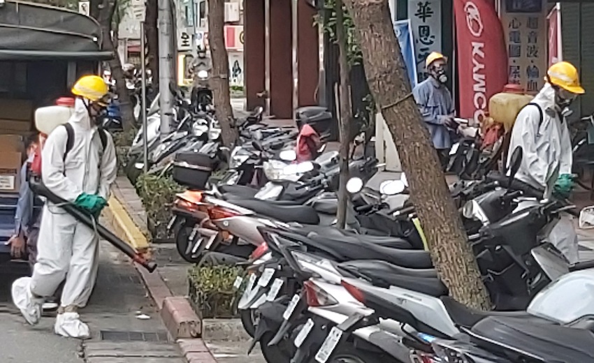 防護服、ガスマスク姿のスタッフによる消毒作業(台北、撮影・葛西健二)