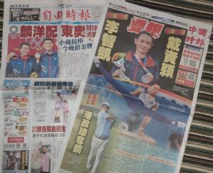 男子ダブルス快挙の余韻が冷めない翌8月1日、世界ランキング1位載資㯋選手出場の女子シングル決勝戦が行われました。対戦相手は陳雨菲選手(中国)。2日連続対中国の決勝戦、そしてバドミントン女王の出場。新聞には「小載接棒今晚槍金牌 (載ちゃんがラケットを繋ぎ今夜金メダルを狙う)」の見出しが躍り、テレビやインターネットでは載資㯋選手の特集が組まれました。