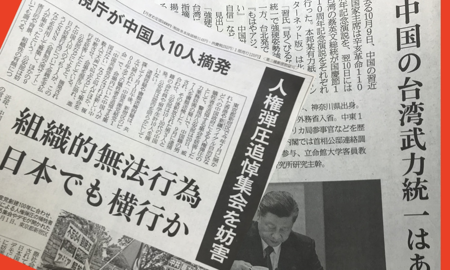 冒頭の中国籍の男らが書類送検された事件は、今年7月1日、新宿区のビルで開かれた「中国共産党結党100年全ての犠牲者を追悼する集会」で、会場内にいた中国人らが共謀して「中国共産党がなければ新しい中国はない」などと叫び、集会を中断させて会場を混乱に陥れた、進行を妨害したという。うち10人を摘発し、7人が今回書類送検されたと報じられている。