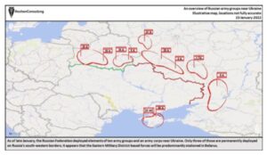 ロシア軍の配備の状況は出典不明の情報が多数出ているが、ウクライナ軍の配備は報道管制のためか、全くわからない。出典は煩雑で、省略する。