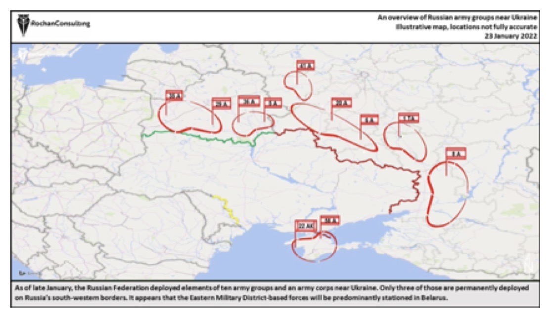 その1月末時点のロシア軍の配置図が、欧米の掲示板に出ていた。Rochan Consultingという英国の安全保障関連のコンサル会社の作成だ。北方に軍が偏在している。ロシア軍は2月20日まで、ベラルーシで演習している。またロシアの精鋭部隊、第1親衛戦車軍は東部国境の後ろに展開している。