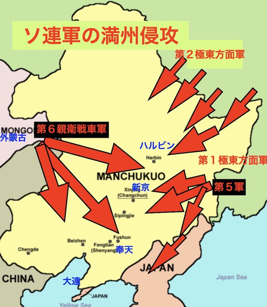 この図を見て連想したのは1945年夏の満州の戦いだ。ソ連軍は250万人の兵力を展開し、70万人前後の日本軍に襲いかかった。モンゴル国境に展開した第6親衛戦車軍、東の第5軍を主攻撃に、その他を助攻撃にした。ソ連軍は国境で全面攻撃をして日本軍を拘束。第6親衛戦車軍は突進し、満州国の中枢部、満鉄の開発した鉄道と、その沿線に並んだ新京(現瀋陽)、奉天など主要都市を制圧した。