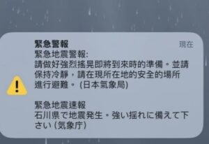 Mirror Mediaの記者が1月3日に石川県で受信した警報。繁体字中国語で記されている
