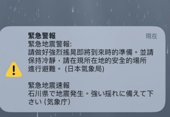 Mirror Mediaの記者が1月3日に石川県で受信した警報。繁体字中国語で記されている