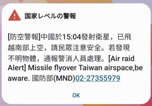 1月9日15時過ぎ、中国から打ち上げられた衛星搭載のロケットが打ち上げられ台湾本島南部の上空を通過したことを受け、台湾国防部は15時17分国家級警報(防空警報)を台湾国内のスマートフォンへ一斉に届けました。確かにこの際の緊急メッセージは中国語と英語の表記でした。この二言語に不慣れな外国人では、咄嗟に意味を理解するのは難しく、迅速な行動をとる妨げになる恐れもあると思います。なおこのメッセージは、中国語は「衛星発射」となっていたのに対し英語では「ミサイル発射」と記されていたことで混乱が生じました。これについて同国防部は誤記であったとして謝罪を行っています。