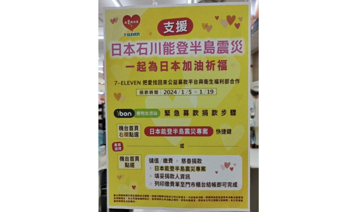 台湾政府は1月4日、能登半島地震の被災地支援と復興協力のため6000万円の寄付を表明しました。同時に民間からの寄付を受け付ける「賑災專戶(義援金口座)」を作ると告知し(衛生福利部1月4日)、5日から銀行・郵便局・ATM・コンビニエンスストアの端末を用いた受付けが開始されました。なおこのシステムは2023年2月6日のトルコ地震被災地義援金送付の際に構築されたものです。
