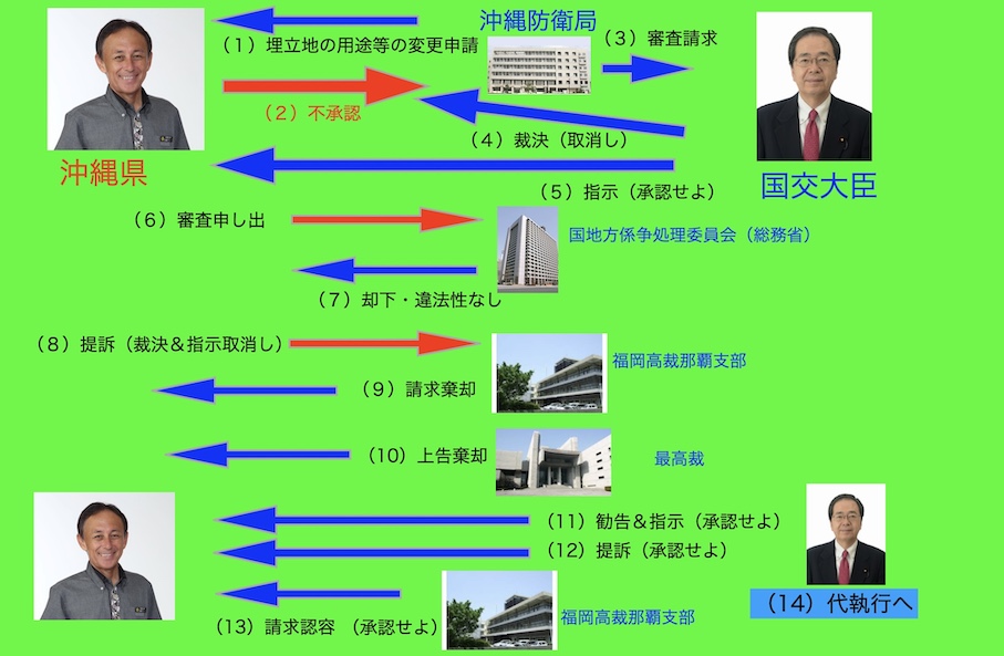 この最高裁判決が確定してもなお、玉城知事は変更申請を承認しなかった。そのため、国交大臣は2023年9月19日付けで地方自治法245条の8第1項に基づき、同27日までに承認するように勧告、さらに同28日付けで同2項に基づき10月4日までに承認するように指示(11)。それでも何らの対応をしないため、10月5日に同法245条の8第3項に基づいて、承認を義務付ける訴えを提起した(12)