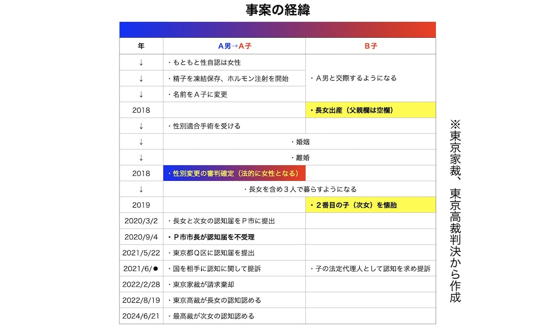 経緯をまとめたのが図1(事案の経緯)である。A男は性自認は女性であり、性交渉によって生殖ができないことから、2018年までに精子を凍結保存し、一方で、性別変更の審判を受けるためホルモン注射の治療を受け始め、さらに名前をA子に変更した。その間、A男とB子は交際するようになり、B子はA男の凍結保存された精子を利用して長女を産んだ。