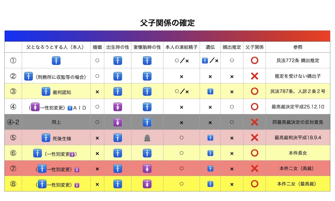④は性同一性障害の女性が「性同一性障害者の性別の取扱いの特例に関する法律」(以下、特例法)に基づき男性に性別を変更し、その後、女性と結婚。AID(非配偶者間人工授精)により、第三者の精子を利用して婚姻の相手の女性が出産したもので、男性としての生殖能力のない夫であっても嫡出推定が及ぶとして父子関係を認めた。