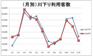 もっとも、「どんこ舟」のハイシーズンは春と秋で、8月は月別の利用者数を見ると2017年、2018年と連続で下から2番目であった。2018年は3月の利用者数が最も多く、およそ5万人に達し8月の2倍近い数字になっている(2018年観光動態調査:柳川市観光課、グラフ参照)。