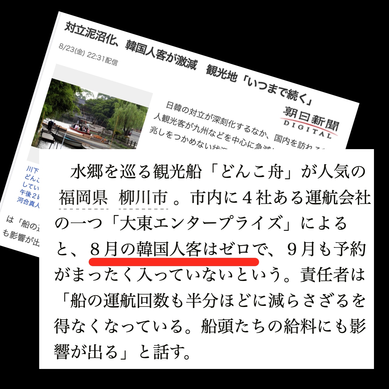 ~水郷を巡る観光船「どんこ舟」が人気の福岡県柳川市。市内に4社ある運航会社の一つ「大東エンタープライズ」によると、8月の韓国人客はゼロで、9月も予約がまったく入っていないという。責任者は「船の運航回数も半分ほどに減らさざるを得なくなっている。船頭たちの給料にも影響が出る」と話す。~(8月23日公開朝日新聞 DIGITALより)