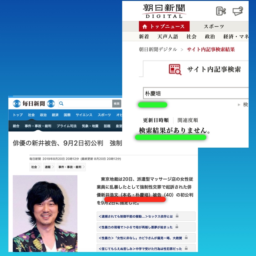 俳優の新井浩文が2月1日に強制性交の疑いで逮捕され、同21日に起訴されたのは記憶に新しい。この新井浩文被告は在日朝鮮人三世(現在は韓国籍と言われる)であり、本名は朴慶培である。ところが朝日新聞は調べた限り実名報道せず、通名で押し通している。サイト内検索で「朴慶培」を入力してもヒットしない。一方、毎日新聞、産経新聞は新井浩文(本名・朴慶培)と実名報道している。