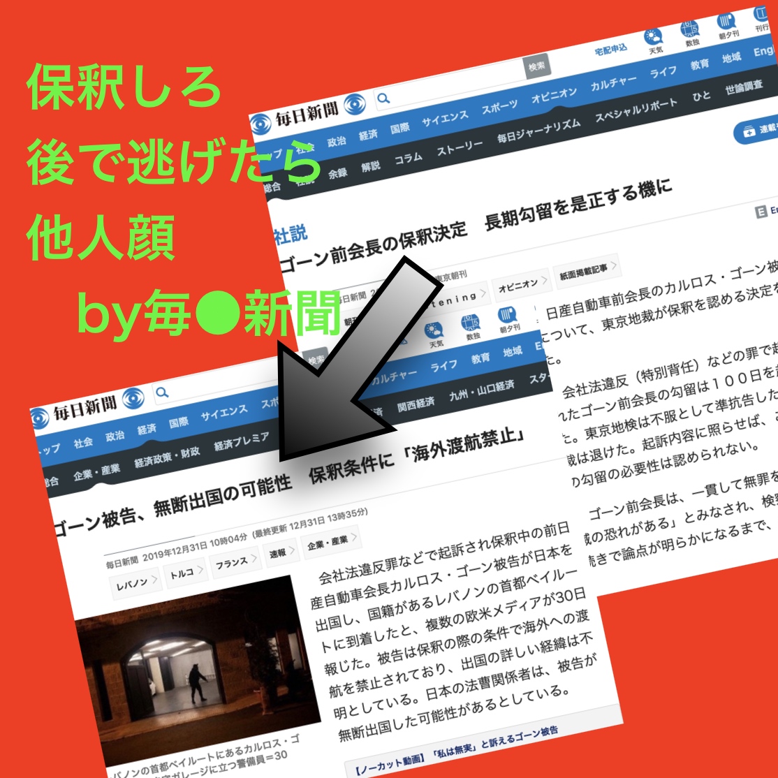毎日新聞、朝日新聞はゴーン被告のレバノン入りを外電等を交えて淡々と事実だけを伝えている。これまで自分たちが書いたことについて、どのように釈明するのか。自らの不明を詫びることがメディアとしての責任の第一歩であると思う。