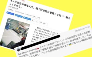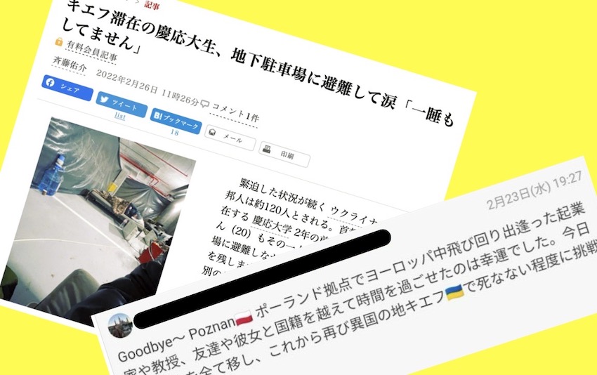 記事は慶大2年のM・T氏(記事では実名)が地下駐車場に避難しつつ「もしものために文章を残します」と現地から発信を続けていることを紹介し、その後、別の場所に移動できたとSNSに投稿したことを伝えている(朝日新聞電子版2月26日付け・キエフ滞在の慶応大生、地下駐車場に避難して涙「一睡もしてません」)。