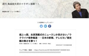 鳥越俊太郎氏は「週刊 鳥越俊太郎のイチオシ速報!!」という有料のコンテンツの発行者となっており、株式会社フーミーが販売事業を行なっている。その最新号はウクライナの問題を取り上げている。タイトルは「超上っ面、お涙頂戴式のニュースしか流さない/ウクライナ戦争報道──日本の新聞、テレビの/歴史観の無さを撃つ!」(3月7日配信)。