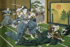>江戸城内の松之大廊下で、小刀で吉良上野介義央の額と背中に切り付けた