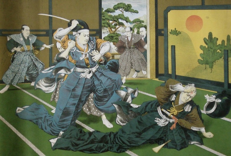 浅野内匠頭長矩は1701年3月14日(旧暦、新暦では4月21日=ke!san・和暦から西暦変換)、江戸城内の松之大廊下で、小刀で吉良上野介義央の額と背中に切り付けた。たまたま現場に居合わせた梶川与與惣兵衛頼照に取り押さえられた。
