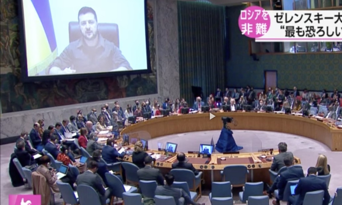 国連安保理で演説するゼレンスキー大統領(NHK画面から)