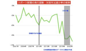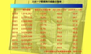 表(1)は2014年以後のスポーツ新聞の発行部数を一覧表にしたものであるが、前年からの減少率を見ると、新型コロナウイルス禍による大幅な減少があった2020年を上回っている。