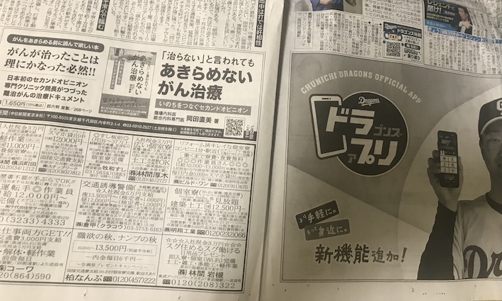 驚いたのは広告。2面、3面は通常、下に5段分の広告が入り、稼ぎどころである。この日の2面に「ドラゴンズアプリ」の広告が入っているが、中日ドラゴンズのアプリであるから、出資者は親会社の中日新聞であろう。他に広告がないために入れたものと推測される。「1か月に⚪︎段以上入れて」という穴埋め的に使用される単価の安い広告の可能性もある。