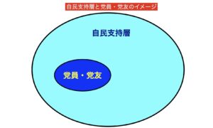党費(一般党員で年額4000円)を納めて積極的に自民党を支持する党員、自民党支持団体(国民政治協会等)の会員である党友は、1900万人程度いると推測される自民支持層の中でも利益関係を持っていたり、自由主義を支えることに強い意識を持っていたり、という核心層と言っていい。