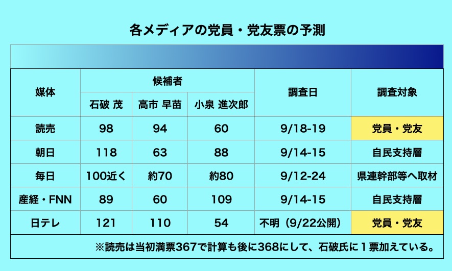 その点、党員・党友票は事前に郵送され、1回目の投票で議員票と同じ368票が割り振られることになり、候補者が上位2人の決選投票に進めるか否かに重大な影響を及ぼす。この党員・党友票に関しては各メディアは取材や調査に基づく予測を公表している(参照・各メディアの党員・党友票の予測)。