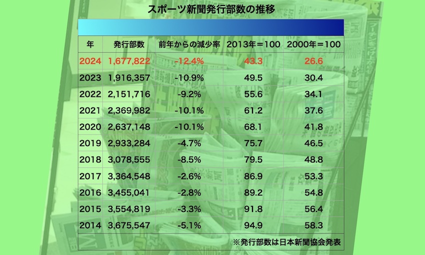 新体制の目的は、新聞発行に頼っていたら、いずれ立ち行かなくなるという危機感によるものであるのは確実。スポーツ新聞全体の発行部数は2020年以後、前年比でほぼ10%減が続いている。2024年は前年比12.4%減と過去最大を記録。2017年から7年で部数はほぼ半減となり、2000年を100とすれば26.6%と、市場はほぼ4分の1になっている(参照・スポーツ紙過去最大の12.4%減 廃刊ラッシュ間近)。