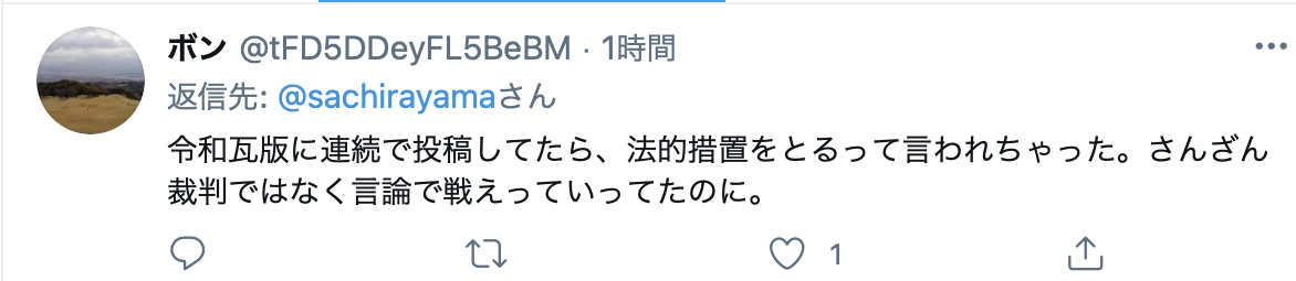 何度も同じ質問をするため投稿の公開をやめ、また、禁じたTwitterのダイレクトメッセージを送ってきたためにTwitter上でブロックしたという経緯がある。今回の大量投稿がそれだけで「ボン」氏であると決めつける気はないが、②~⑥はハンドルネームから同一人物である可能性が高いこと、また①からの投稿は内容から②~⑥と同一人物である可能性が高いこと、そして「ボン」氏は③のIPアドレスから似た主張の投稿をしたことがあり、また、自らのTwitterで「令和瓦版に連続で投稿してたら、法的措置をとるって言われちゃった。さんざん裁判ではなく言論で戦えっていってたのに。」とツイートしていたことから、間違いはないと判断する。