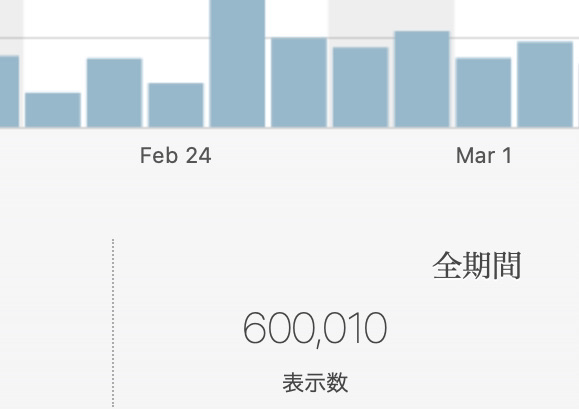 当サイト開設して11か月の3月6日、通算で60万PVに到達した。年明けからコンスタントにアクセス数が増えており、オープンから1年を前に区切りの数字となった。