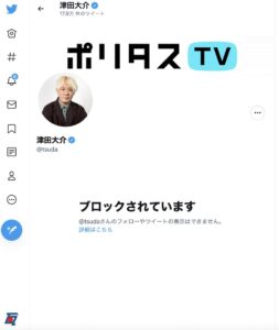 なお、当サイトのツイッターのアカウントは、津田大介氏からブロックされていることも、この機会に紹介しておこう。津田氏からすると目障りな存在となっているようである。
