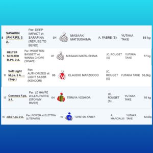 1Rのマルセルブサック賞はディープインパクト産駒で、デビューから2連勝中のサヴァランで挑む。母サラフィナは仏オークス馬である。G2エアリースタッドS勝ちのアルビグナに次ぐ単勝2番人気が予想される。ここはチャンスがありそう。