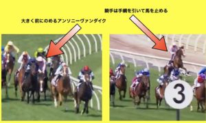 ピンクの勝負服のアンソニーヴァンダイクは道中、内ラチ沿いの7番手付近を追走、最終コーナーを回って先行勢をとらえにいくところで悲劇が発生した。報道では左前脚の球節(人間の指の付け根の部分)を骨折、馬の頭が地面につくぐらい前のめりになった。