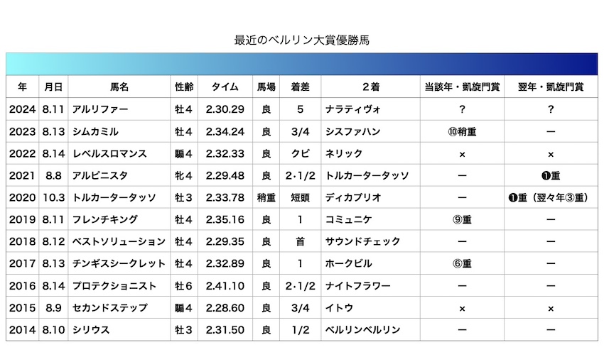 ベルリン大賞を勝った年に凱旋門賞に出走した馬は3頭おり、最も成績が良かったのが2017年のチンギスシークレットの6着。このチンギスシークレットは凱旋門賞の前に前哨戦のG2フォワ賞を優勝しており、この時にサトノダイヤモンド(4着)、サトノブレス(6着)の2頭の日本馬を負かしている。凱旋門賞6着もそれなりに実力を出したものと考えられる。