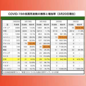 日本では3月2日から学校の休業が始まったが、その日のデータで死者は6人。それが3月20日のデータでは31人と5倍程度で済んでいる。日本とイタリア、防疫対策の違いでここまで状況が変わってしまうのかと驚かずにはいられない。