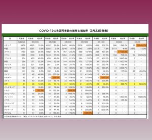 他の地域を見ると、アジアでインドネシアの増加が目につく。同国政府は3月11日に最初の死者(外国人)が出たことを明らかにしているが、その後、死者は増え3月23日のデータで38人と東南アジアで最多となっている。