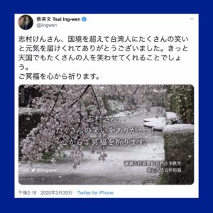 折しも、台湾(中華民国)の蔡英文総統が、ツイッターで志村けんさんを悼むツイートをしたばかり。