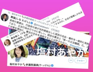 塩村議員として休業要請に反対していないのは、2月28日に立憲民主党も参加している新型コロナウイルス合同対策本部が文科省に「学校休業に関する申し入れ」を行ったことと関係がありそう。申し入れでは休業そのものをやめるようには求めず、休業に伴う混乱が生じないように求めるものであったことから、その時点で党としては休業やむなしの判断であったと思われる。そのため、自らの口から「休業はおかしい」とは言えなかったのであろう。